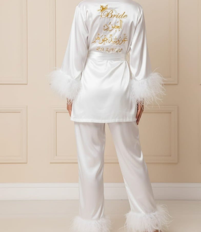 تألقي في أجمل لحظاتك مع طقم العروس المصمم من قماش الساتان الناعم واللامع، مع لمسات فاخرة من الريش الأبيض على الأكمام وأسفل البنطال ليمنحك إطلالة أنثوية راقية.
